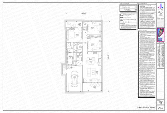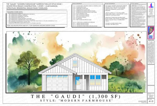 1,300 SF (1,762 Total) 3-Bed, 2-Bath, 1-Car Garage, 1-Story American Craftsman, Modern Farmhouse, Narrow Thin-Lot Style Home, Wood Stick-Frame, 1-Story, 1-Car Garage, Open-Plan connecting Kitchen / Living Room / Pantry, Utility Room, Covered Entry Porch, Hallway Gala, Covered Rear Porch, Size: 30' x 60', 40' x 100' Lot-Fit.